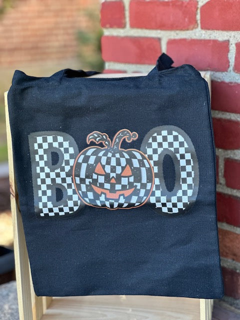 Make an edgy statement this Halloween season and carry your treats in style with this must-have tote! The bold design spells out “Boo” in a black and white checkerboard pattern, with one O transformed into a checkered pumpkin for a festive twist. It's perfect for collecting goodies or adding a trendy touch to your festive look.