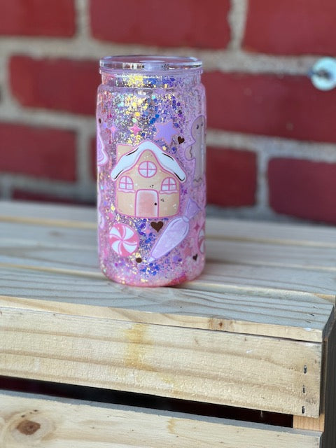 Indulge in holiday cheer with our Christmas Cookie Snow Globe Cup! This cup sparkles with pink glitter snow, capturing a whimsical gingerbread wonderland right in your hands. With a gingerbread house, a cookie character, Christmas tree cookies, and an adorable icing pipe, every sip transports you to a festive kitchen filled with sugary delights.