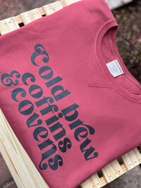 Channel your inner dark queen with the Cold Brew, Coffins, and Covens Sweatshirt. In a rich burgundy hue, this cozy crewneck sweatshirt features bold black lettering that speaks to your love for all things spooky and stylish. Made from a soft cotton and polyester blend, it's perfect for chilly days when you're sipping on your favorite cold brew, embracing your mysterious side, or plotting your next coven meeting. A must-have for those who enjoy a little edge with their comfort—this sweatshirt is as cool as it is cozy.