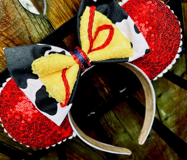 Giddy up, partner! These Cowgirl Mouse Ears are a must-have, paying homage to the iconic cowgirl, Jessie! Featuring bold red sequined ears with a white trim, these ears are topped with a double bow that embodies Jessie's playful spirit. The larger bow boasts a classic cow print, while the smaller yellow sequined bow adds a touch of shine. A red lasso weaves through the center, just like the one our favorite cowgirl uses to wrangle up trouble.