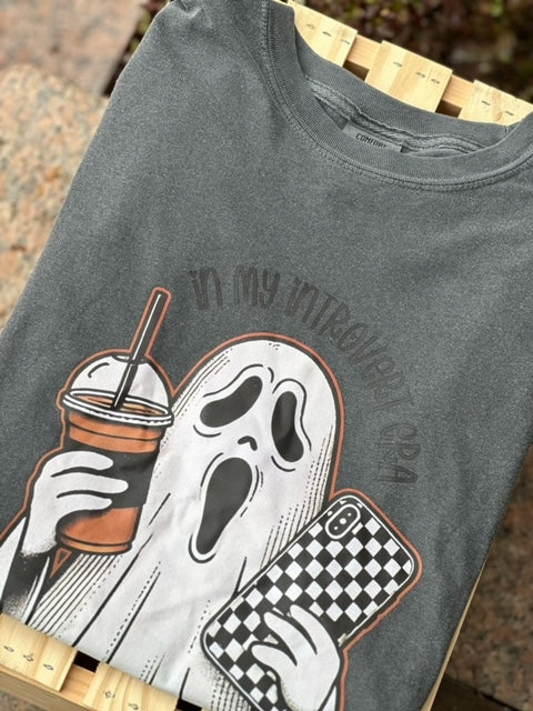 Step into your Introvert Era with this cozy beige crewneck T-shirt, perfect for embracing your love of quiet moments and comfort. Featuring an adorable ghost holding an iced coffee and a phone with a trendy checkerboard case, this T-shirt is a playful nod to those moments when you’re just vibing in your own space. Made from 100% cotton, it's the ultimate piece for lounging, sipping coffee, or scrolling through your favorite apps. Whether you're out with friends or tucked away in your own world, this is your new go-to for stylish introvert energy.