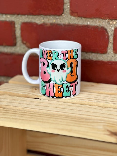 Get ready to laugh and sip with our Over the Boo Sheet Mug! Featuring an adorable rosy-cheeked ghost that’s “over the boo sheet,” this whimsical design is complemented by bold bubble letters in pastel pink, green, and orange. Perfect for hot beverages or cold drinks, this ceramic mug is a delightful addition to your Halloween collection or a fun gift for fellow ghost enthusiasts.