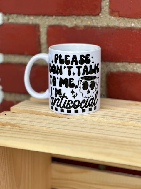 Make your feelings known with our Don’t Talk to Me Mug! This sleek white ceramic mug boldly proclaims, “Don’t Talk to Me I’m Antisocial” in striking black writing, perfectly capturing the essence of those quiet moments when you just need a little space. It is the perfect companion for introverts and anyone who appreciates a little alone time. Treat yourself or give it as a gift to the friend who understands the power of “me time!”