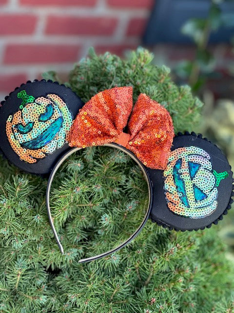 Add a touch of magic to your Halloween style with these handmade Pumpkin Mouse Ears! Each pair is one of a kind, featuring sparkly sequin pumpkins on either side and a matching sequin bow in the center, making these ears the perfect accessory for the spooky season. Whether you're headed to the parks or just want to bring some festive flair to your everyday look, these ears will make you stand out in the most enchanting way.