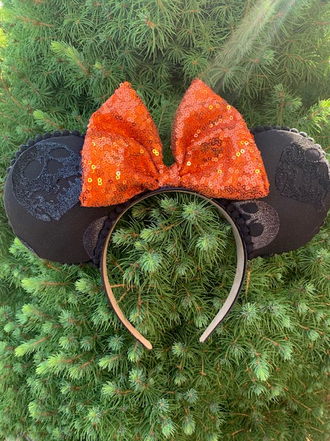 Embrace your spooky side with these Skull Mouse Ears! Featuring glittered black skulls on each ear and a bold, sequined bright orange bow in the center, these ears are perfect for adding a touch of edge to your look. Whether you're getting into the Halloween spirit or just love a little extra drama, these ears bring a fun, festive vibe that's sure to turn heads. Comfortable, stylish, and full of personality, they're a must-have accessory for anyone who loves to make a statement.