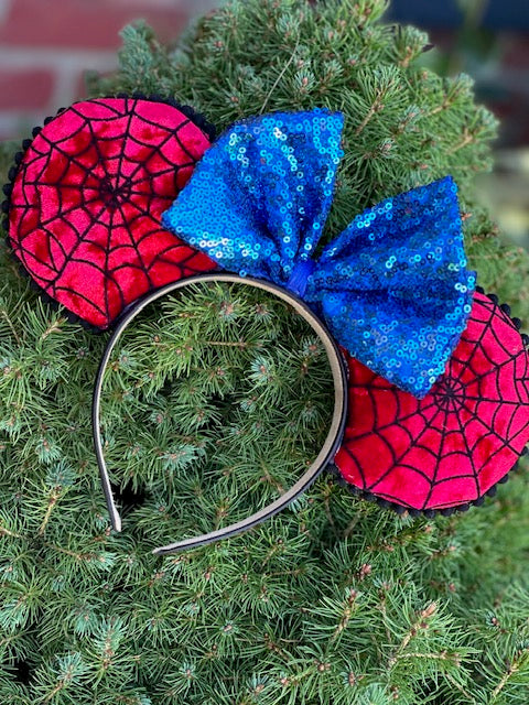 Swing into style with these Spiderman-inspired Mouse Ears! Featuring vibrant red ears with detailed spider web patterns in white, these ears capture the essence of your favorite superhero. The bold, sequined royal blue bow in the center adds an extra pop of flair, making these ears perfect for fans who want to showcase their love for Spidey in a unique way. Whether you're web-slinging through the day or just showing off your fandom, these ears are the perfect accessory.