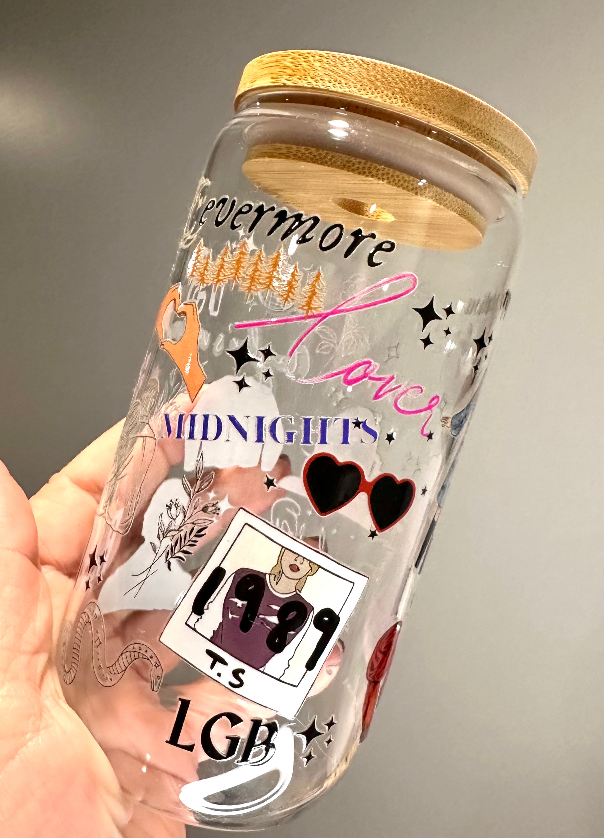 Channel your inner Love Story writer with our Storyteller glass cup! Featuring iconic symbols, lucky number 13, album titles, and subtle nods to fan-favorite moments, this Libbey-style glass cup with a wooden lid is a must-have for any fan of the iconic, storytelling superstar. Whether you’re re-listening to every era or planning your next concert outfit, this 16 oz cup keeps your favorite drink close and your fandom even closer.