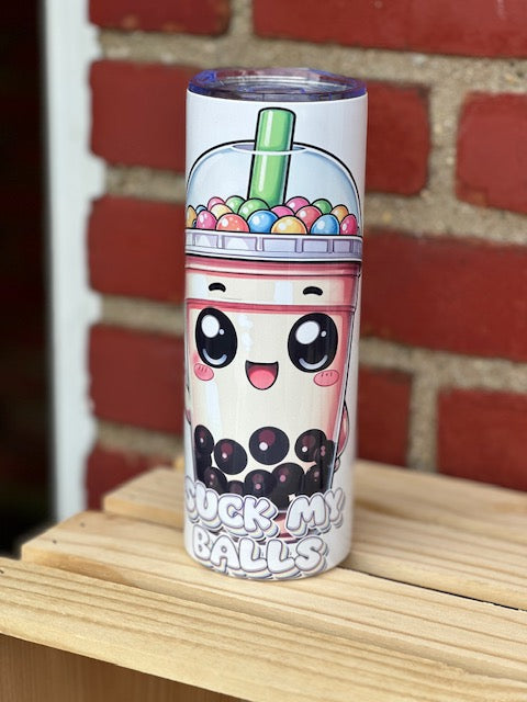 Life’s too short for boring tumblers. Add some sass to your sip with our cheeky “Suck My Balls” sublimination tumbler, featuring a playful cup of colorful bubble tea! Whether you're enjoying your favorite boba or another drink of choice, this white stainless steel tumbler keeps your beverages hot or cold with style and humor.