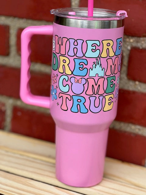 Drink in style with our whimsical “Where Dreams Come True” tumbler. Perfect for dreamers on the go. Take it with you on your next amusement park adventure and make every sip a reminder that dreams really do come true!