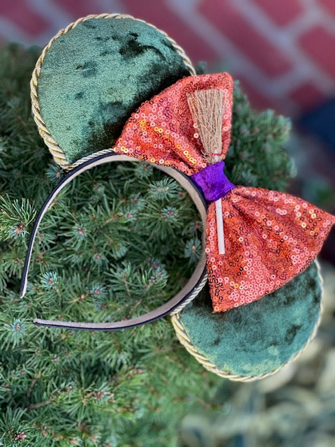 Get ready to cast a spell with the first design in our Witch Sister Mouse Ears collection, inspired by the iconic Sanderson sisters! These vibrant mouse ears capture the magical essence of everyone's favorite trio of witches, with a striking combination of green, purple, and orange. Perfect for fans of the notorious witches, these ears are a must-have for spooky season or any enchanted adventure.