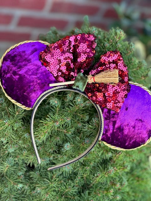 Embrace the magic with the second design in our Witch Sister Mouse Ears collection, paying tribute to the iconic Sanderson sisters! This enchanting pair features deep purple ears with gold trim, a rich burgundy sequined bow, and a witch’s broom in the center—perfectly capturing the essence of the spellbinding trio. Whether you're channeling your inner witch or gearing up for a Halloween adventure, these ears are a wickedly fun way to show your love for the Sanderson witches.
